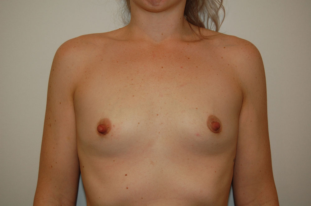 A 34-year-old female desired breast augmentation. Bilateral augmentation was performed with implants filled to 375cc and 425cc. Photos at 4 months post-op exhibit the patient’s results.