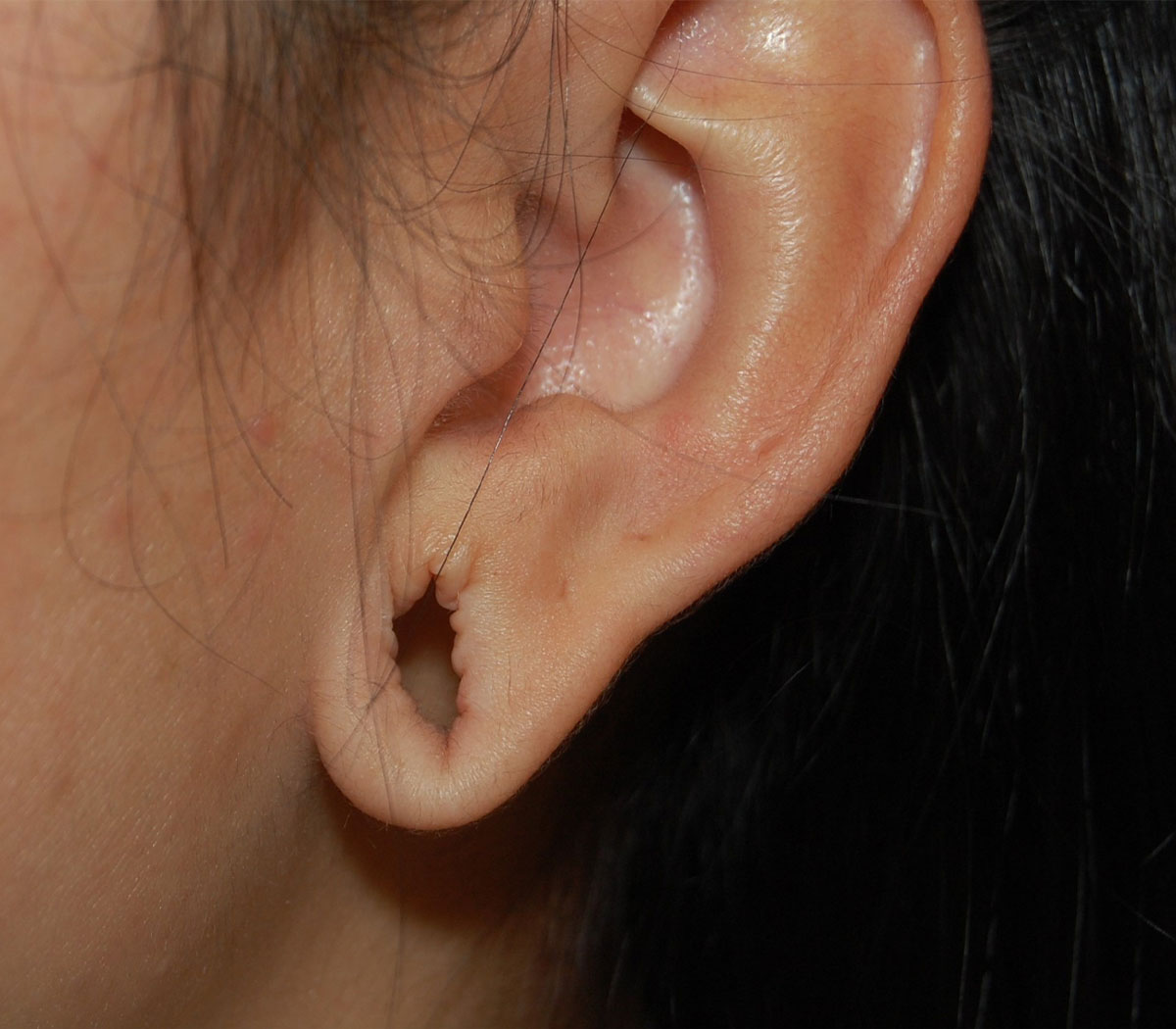 25-year-old female with previously gauged ears. Repair of ear lobes was performed. Photos show 6 months post-op results.